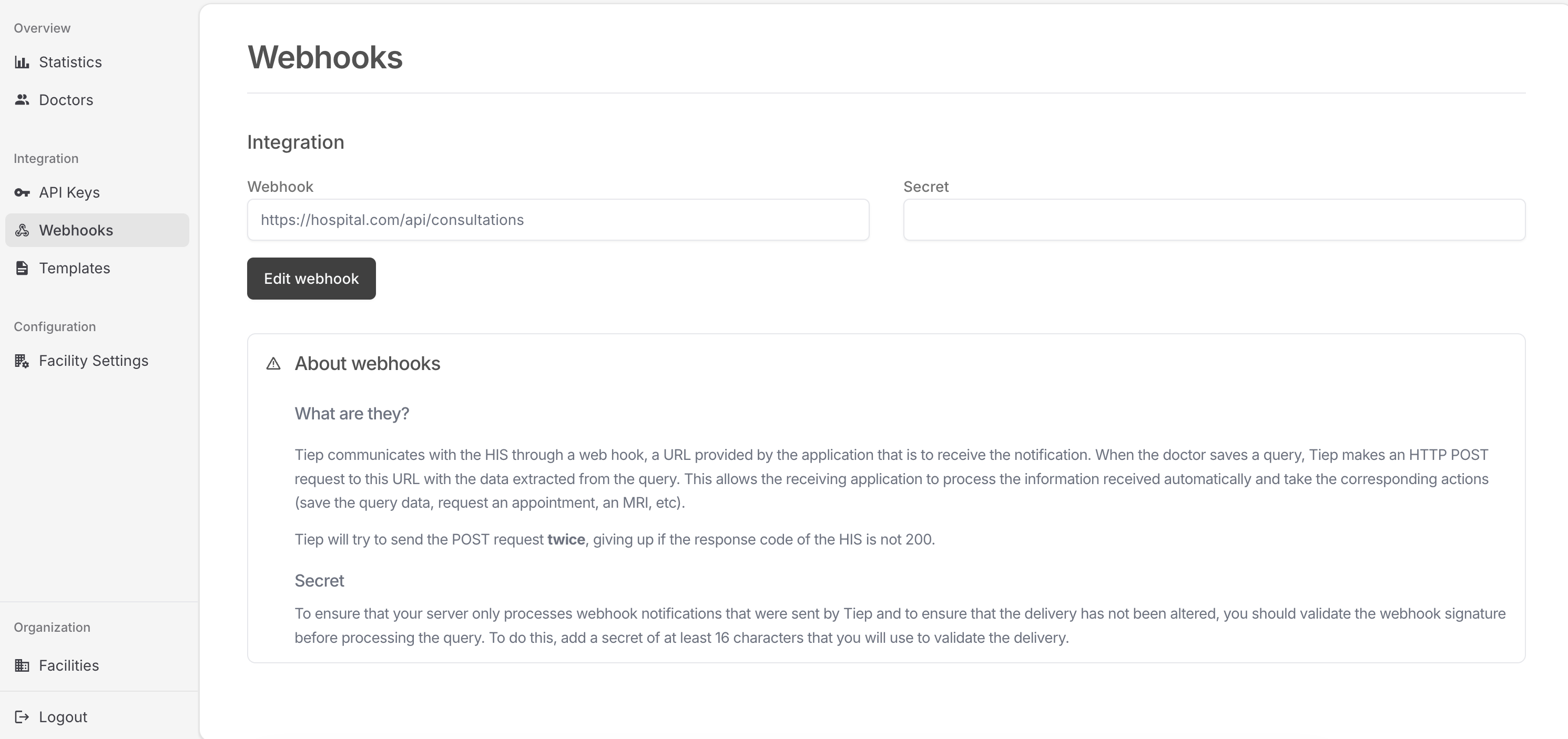 In the platform, navigate to Settings → Integration and provide the HTTPS endpoint that will receive webhook calls. Define a webhook secret (16 characters minimum) as Tiep uses it to sign every payload.